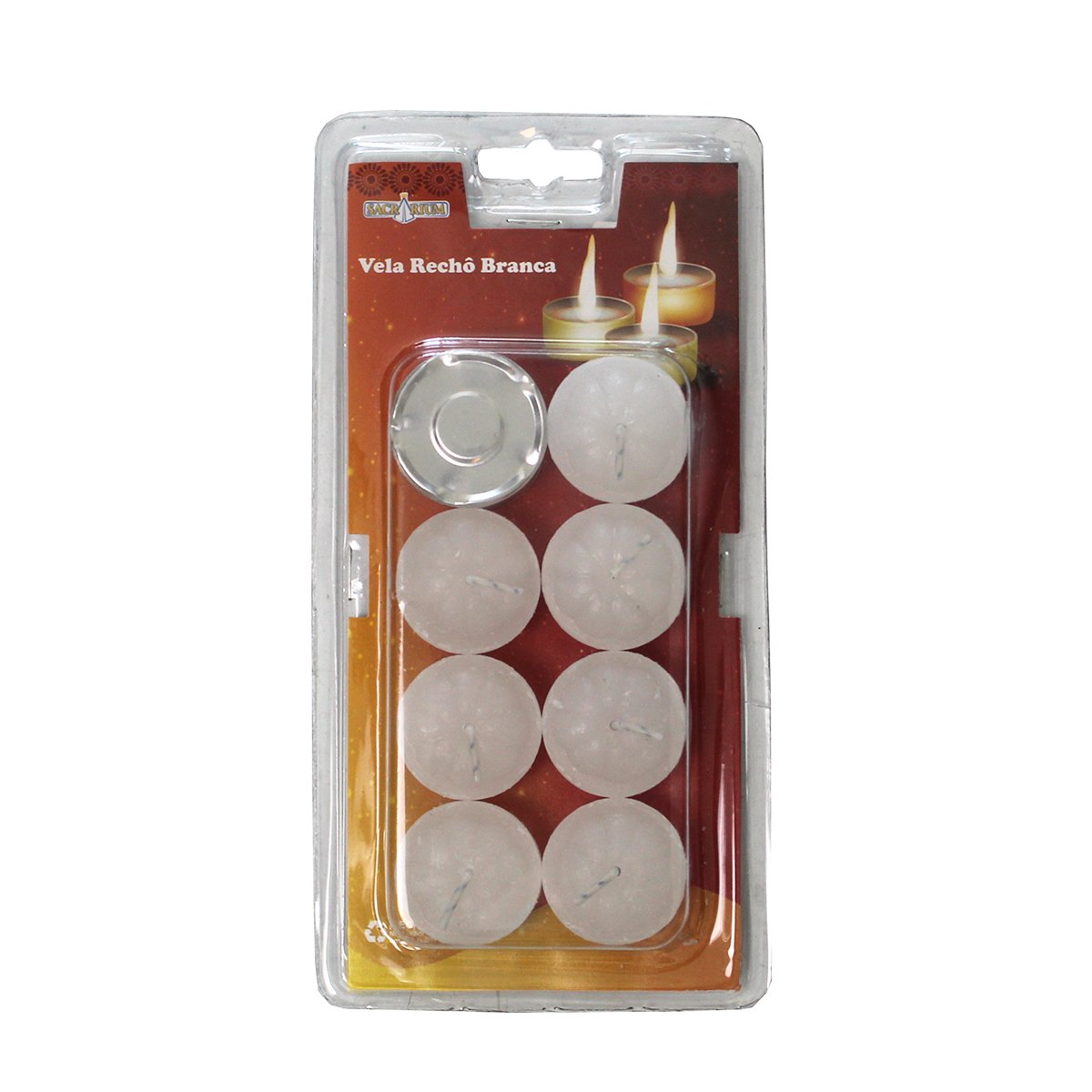 Vela modelo rechô, mede 1,5 cm de altura e 3,5 cm de diâmetro. Disponível em kits com 7 unidades e 1 vasilhame de alumínio para queima, nas cores branca ou sortidas. Composição: Parafina, Corante e Pavio.
