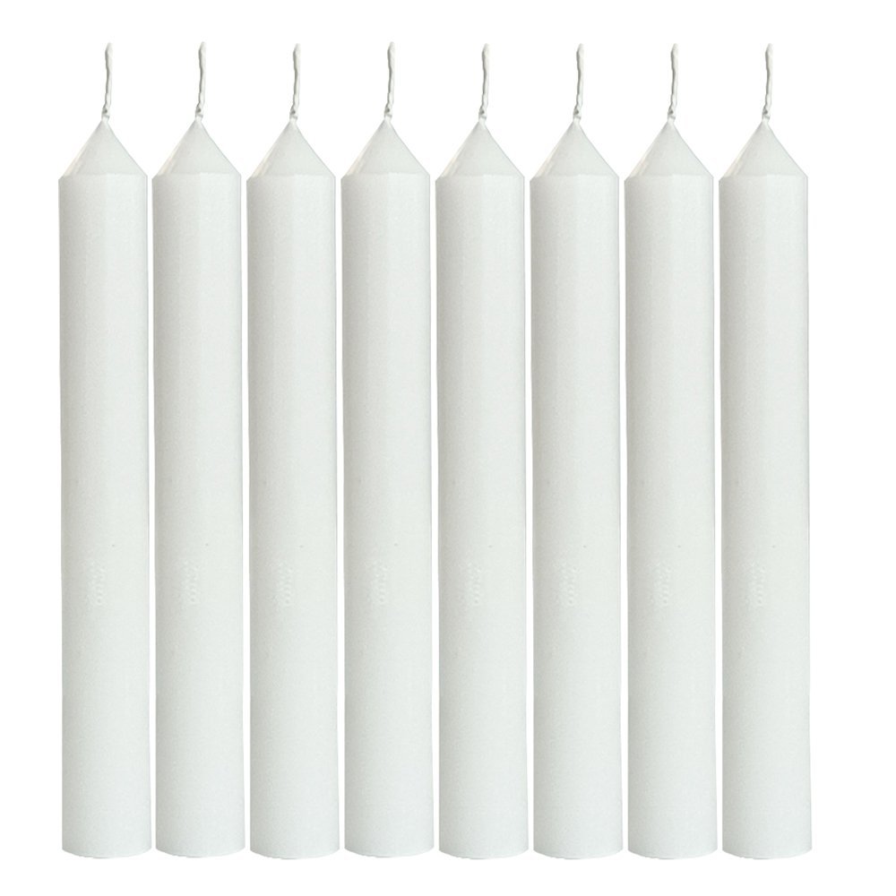 Velas tradicionais do modelo palito medindo 12,5 cm de altura e 1,5 cm de diâmetro, na cor branca. Cada pacote contém 8 velas.
