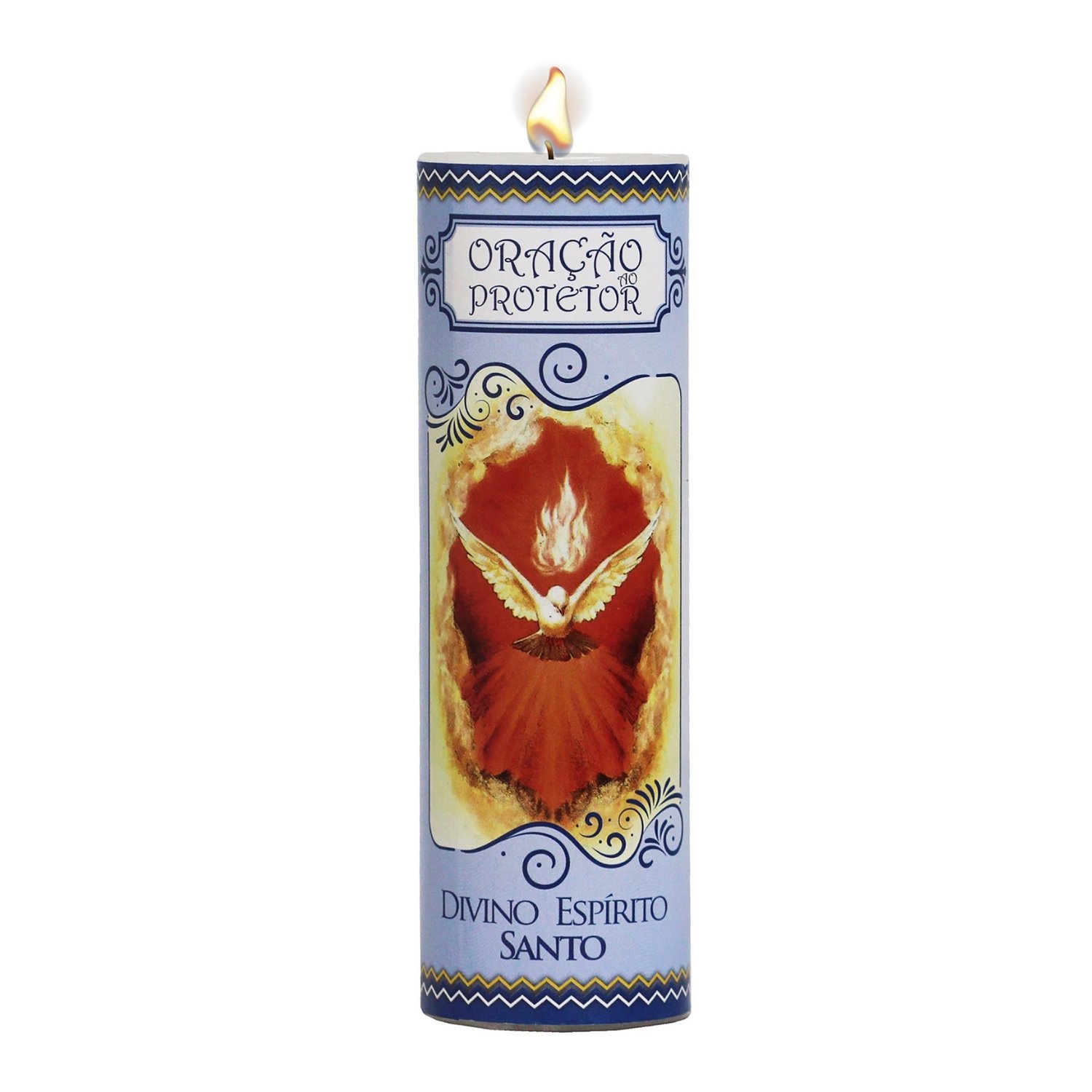Vela medindo 14,5 cm de altura e 4 cm de diâmetro, na cor branca.