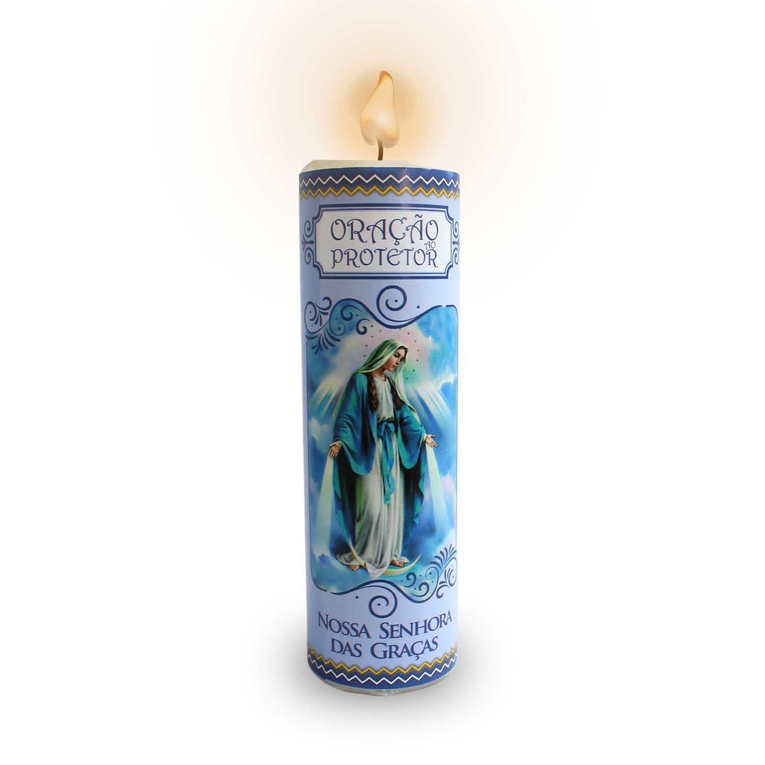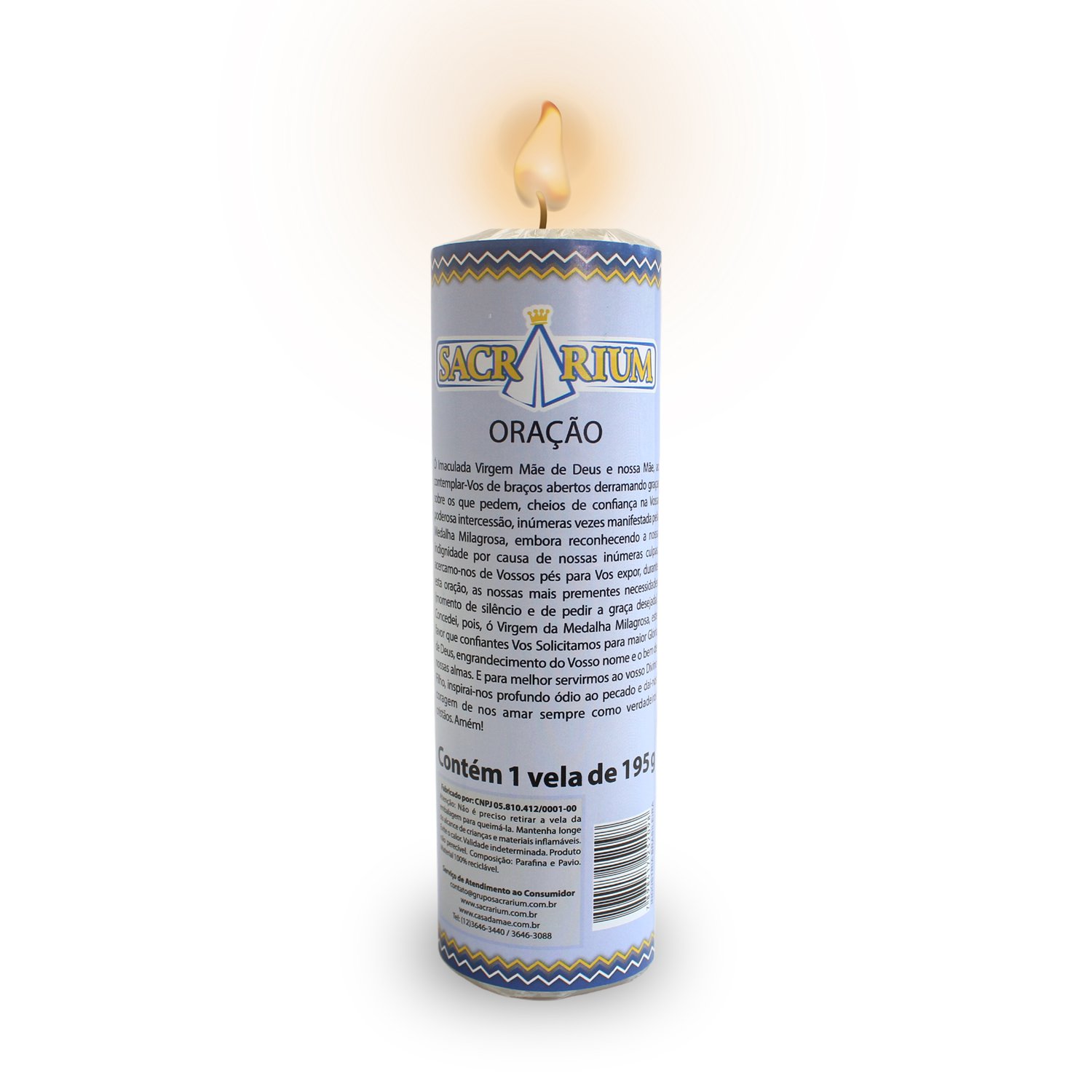Vela medindo 14,5cm de altura e 4cm de diâmetro, na cor branca. Disponível aproximadamente 47 santos de devoção. Composição: Parafina, Parafina de Palma e Pavio.