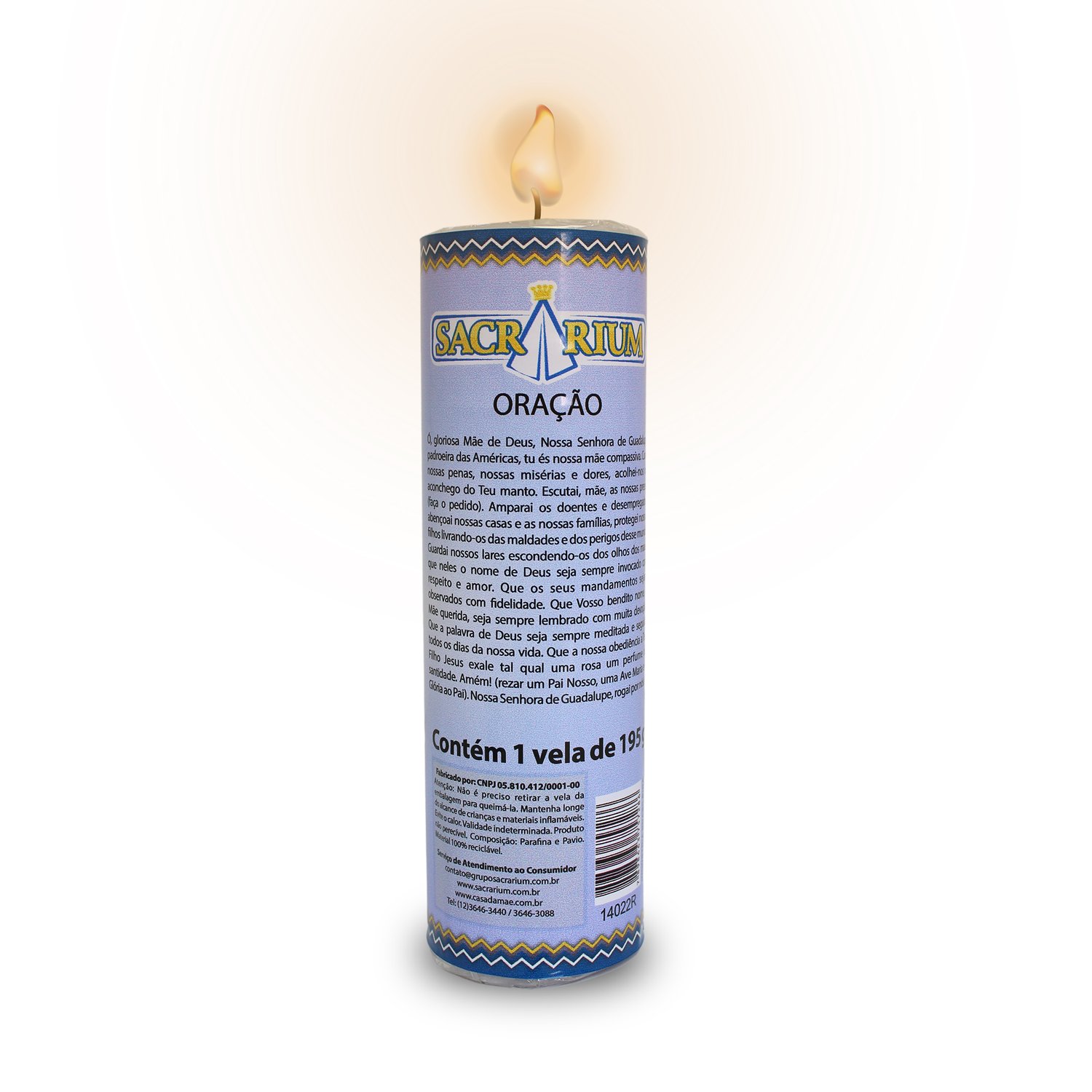 Produzida com parafina de alta qualidade e parafina de palma, oferece uma queima limpa e duradoura, ideal para ambientes de oração, igrejas e devoções pessoais.