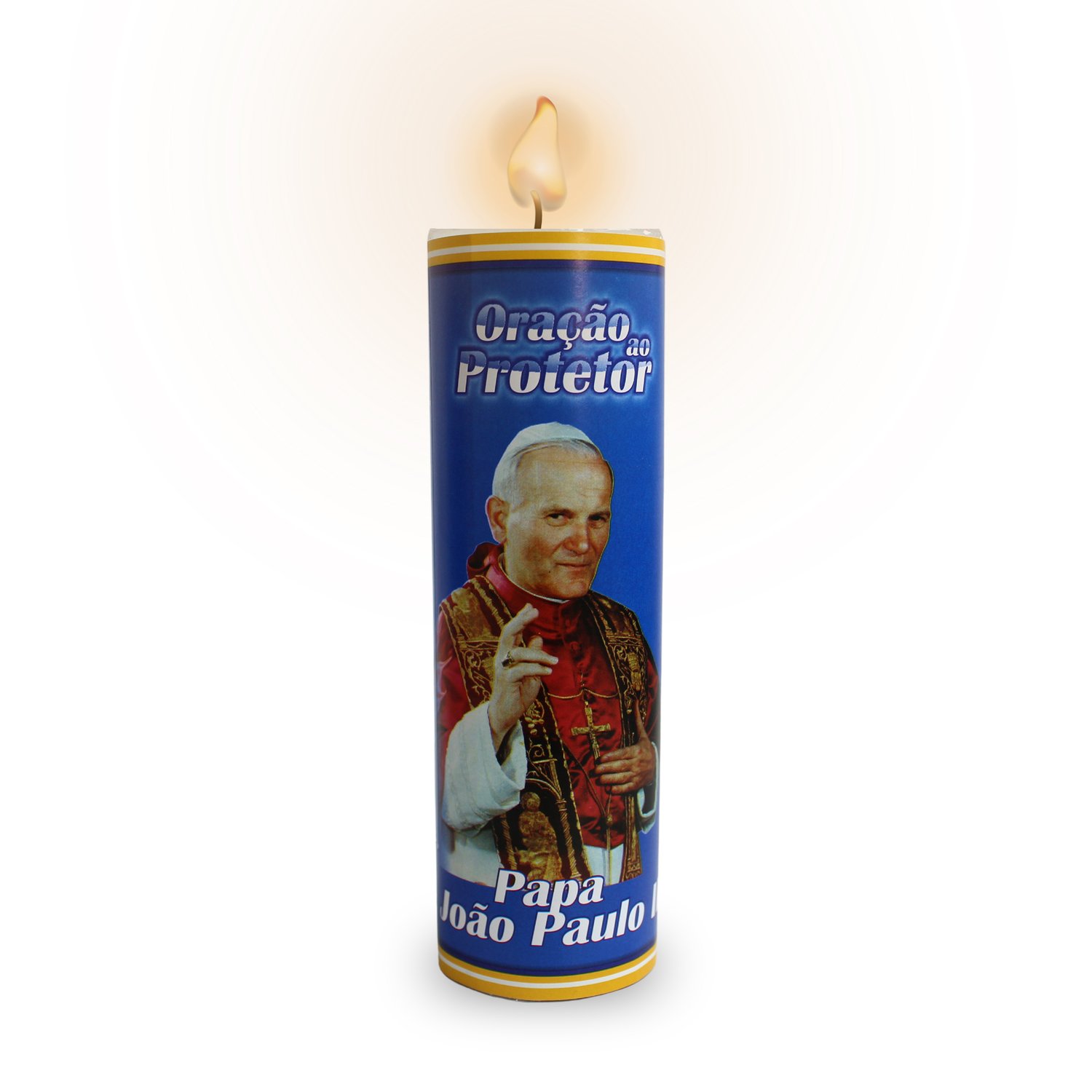 Vela medindo 14,5 cm de altura e 4 cm de diâmetro, na cor branca.
