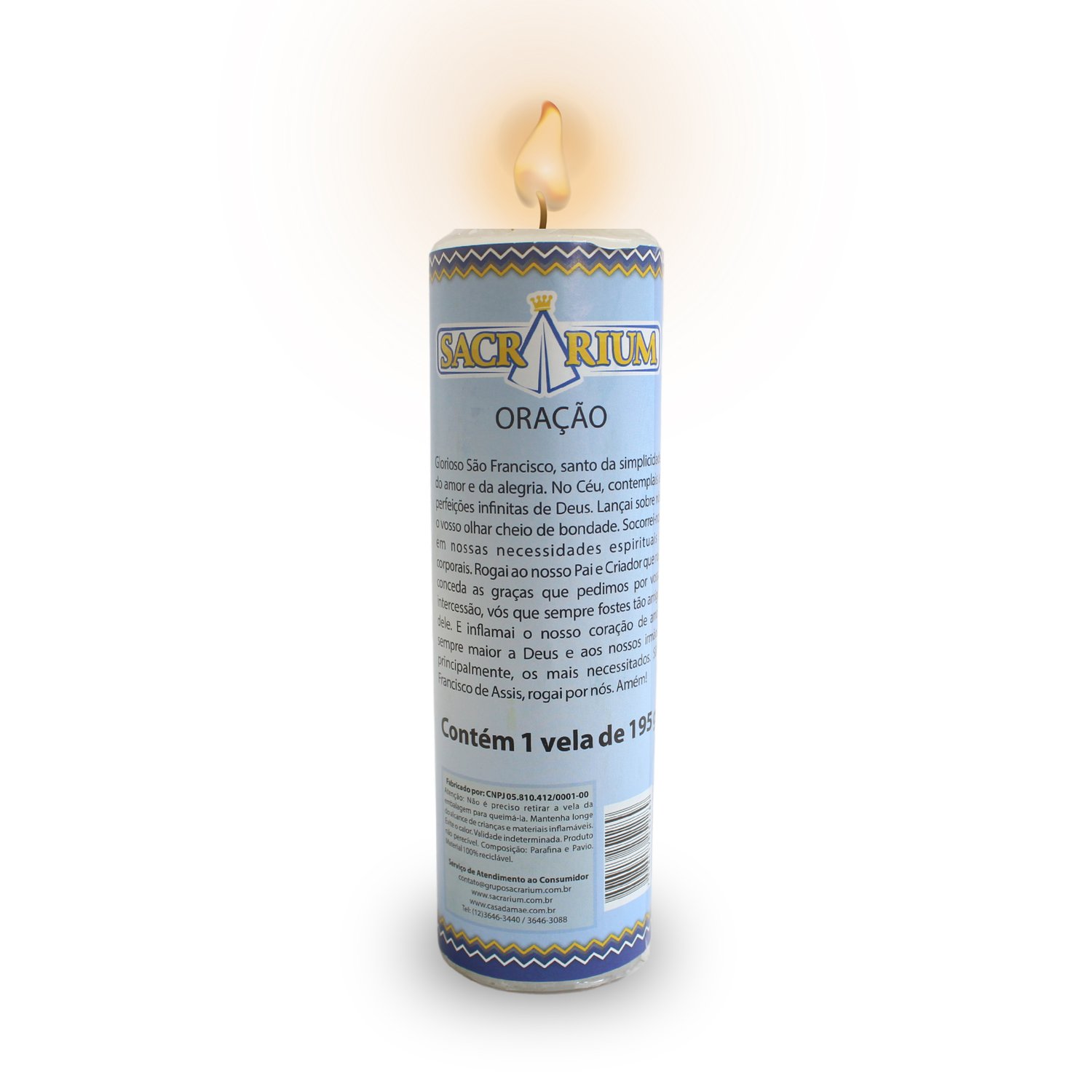 Vela medindo 14,5cm de altura e 4cm de diâmetro, na cor branca. Disponível aproximadamente 47 santos de devoção. Composição: Parafina, Parafina de Palma e Pavio.