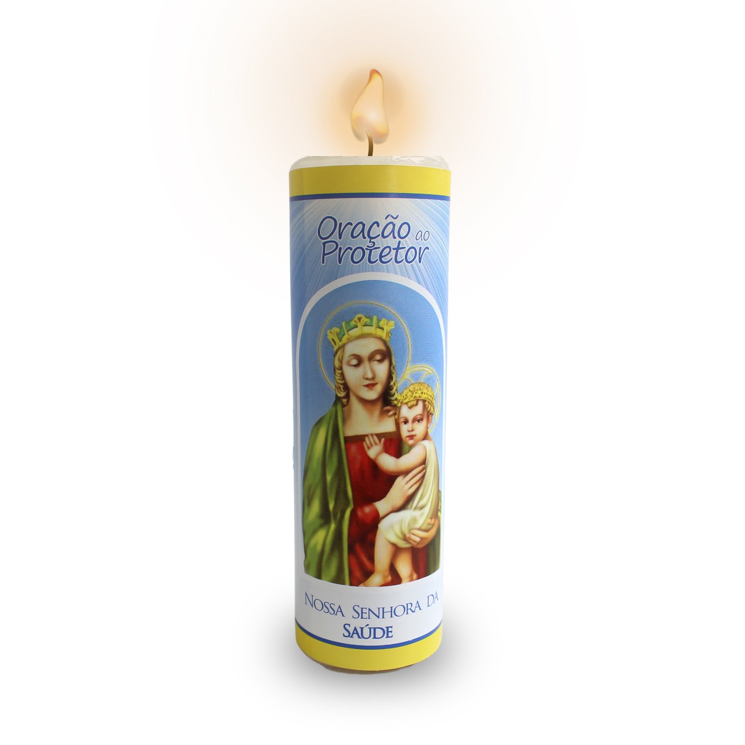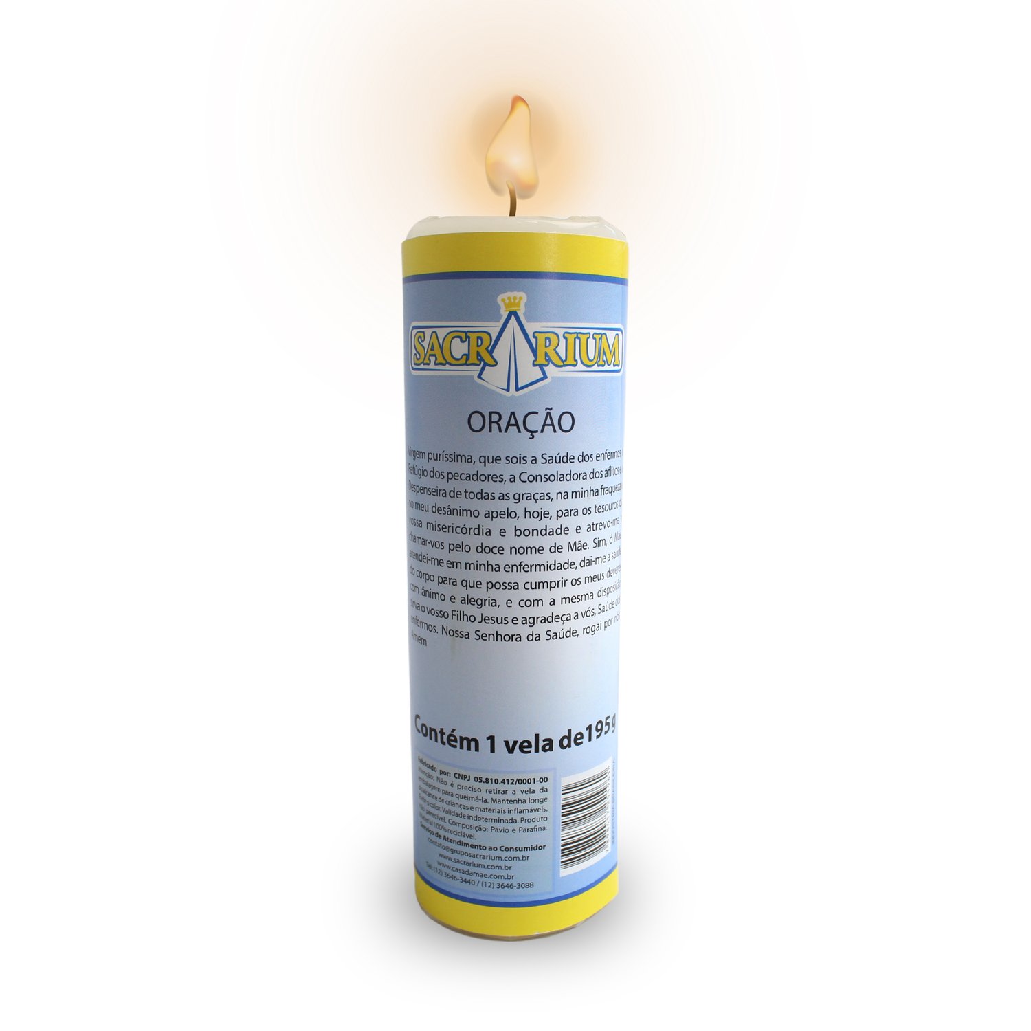 Vela medindo 14,5cm de altura e 4cm de diâmetro, na cor branca. Disponível aproximadamente 47 santos de devoção. Composição: Parafina, Parafina de Palma e Pavio.
