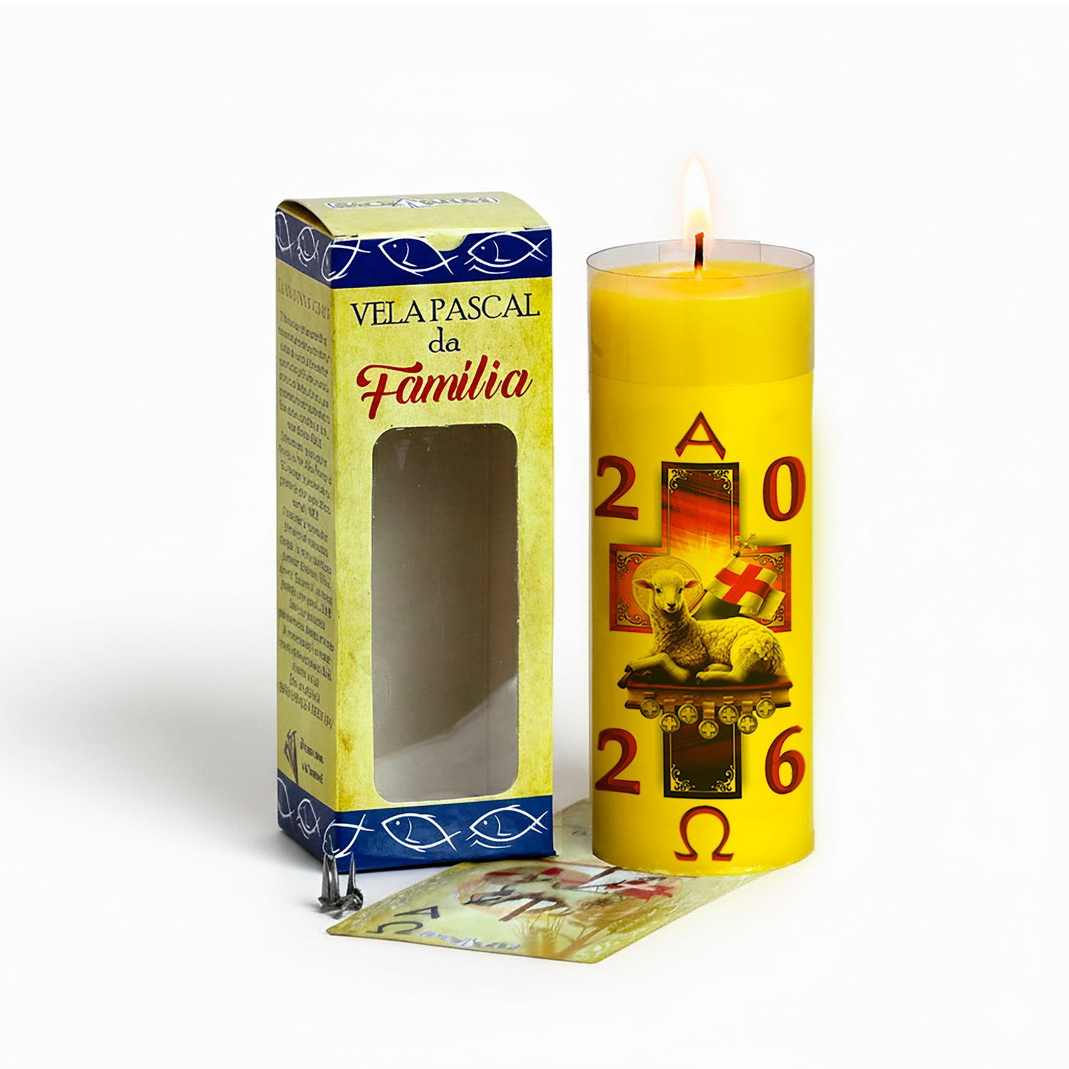 Vela Pascal da Família tradicional, produzida em parafina nas cores amarela ou branca.