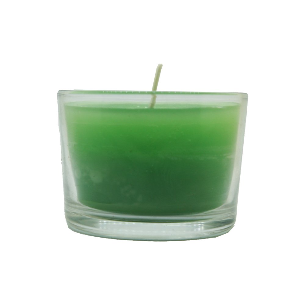 Vela no vidro, recipiente medindo 5,5 cm de altura e 7,5 cm de diâmetro, vela na cor verde.