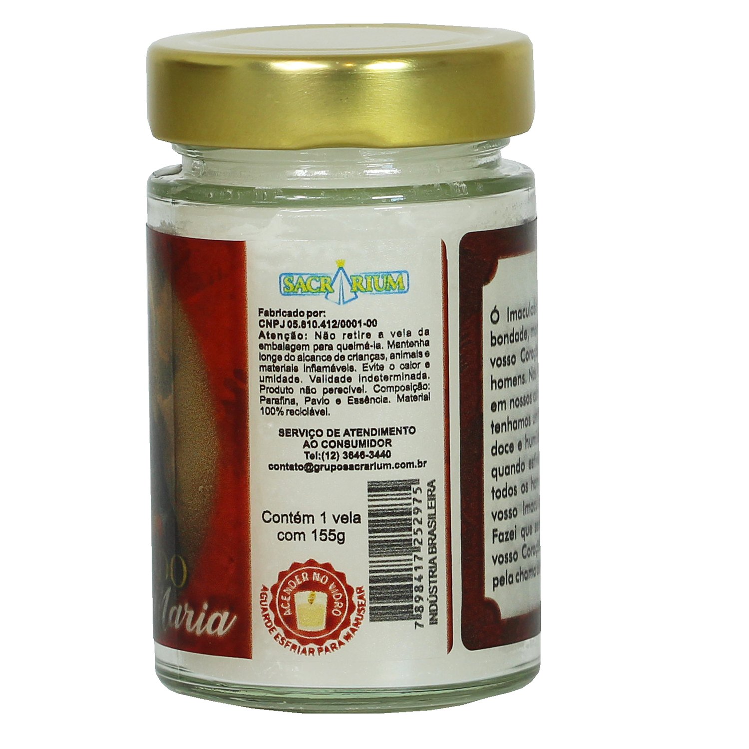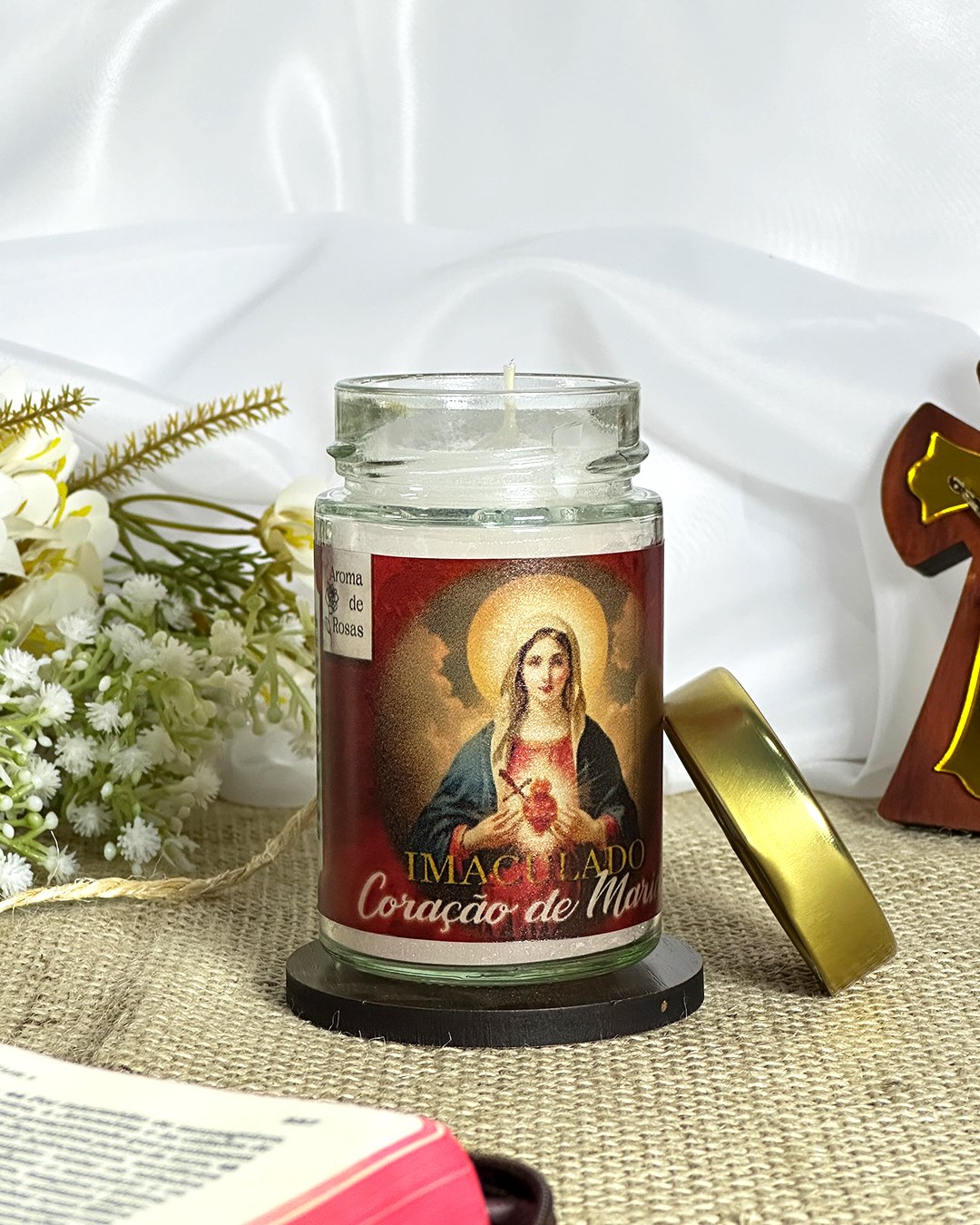 Esta vela em vidro com tampa dourada combina elegância e espiritualidade, perfeita para momentos de oração ou para presentear com carinho nesta época especial.
