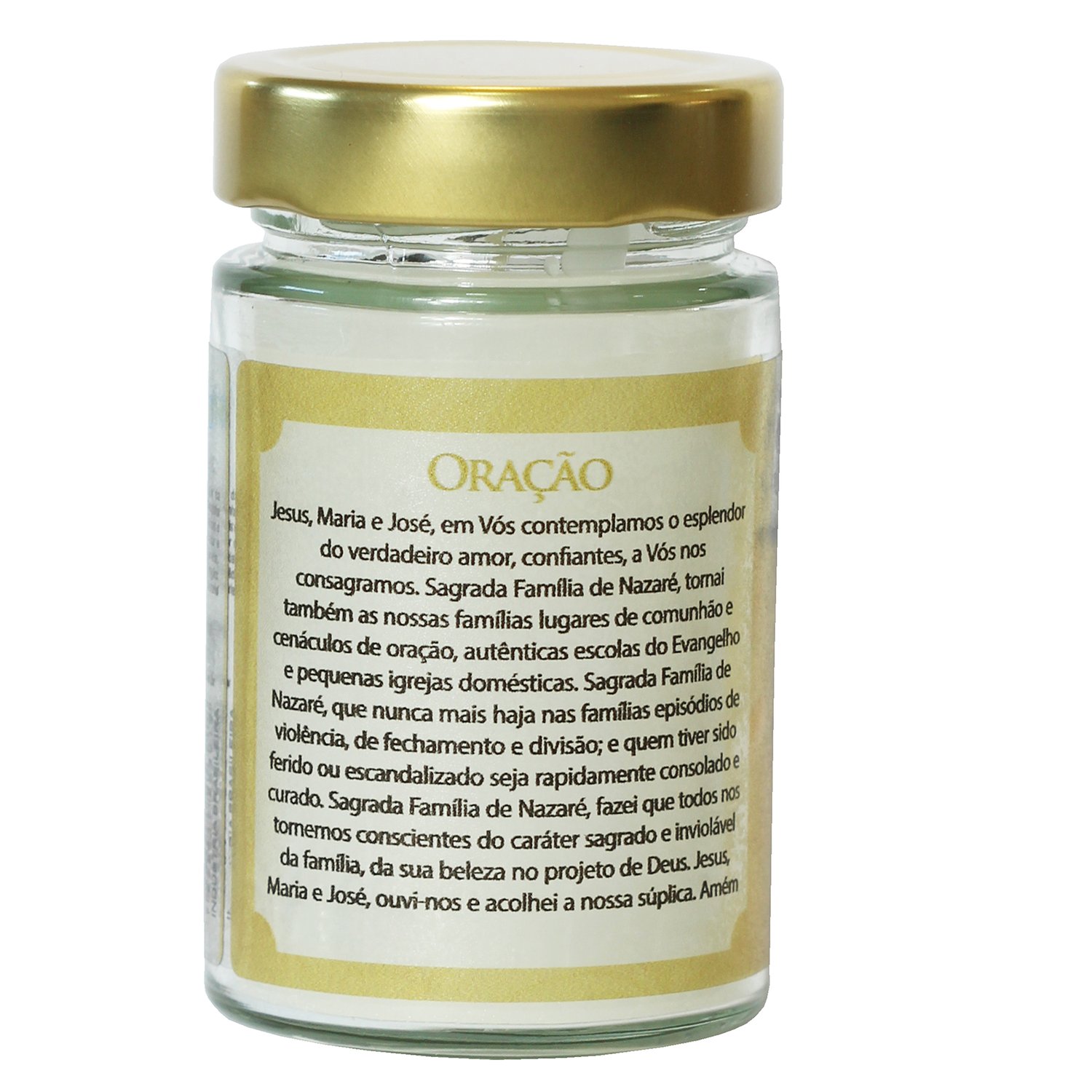 Vela Vidro com tampa dourada, recipiente medindo 10 cm de altura e 6 cm de diâmetro, vela na cor branca aromatizada de rosas. A queima da vela deve ser feita dentro do recipiente.