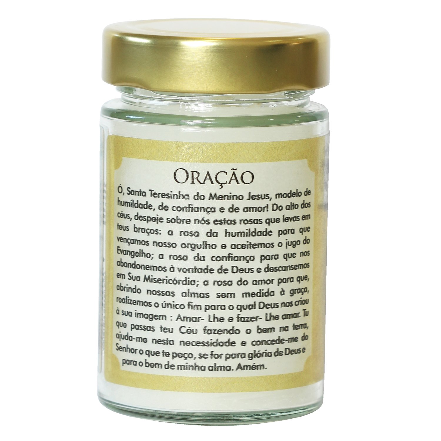Vela Vidro com tampa dourada, recipiente medindo 10 cm de altura e 6 cm de diâmetro, vela na cor branca aromatizada de rosas. A queima da vela deve ser feita dentro do recipiente.