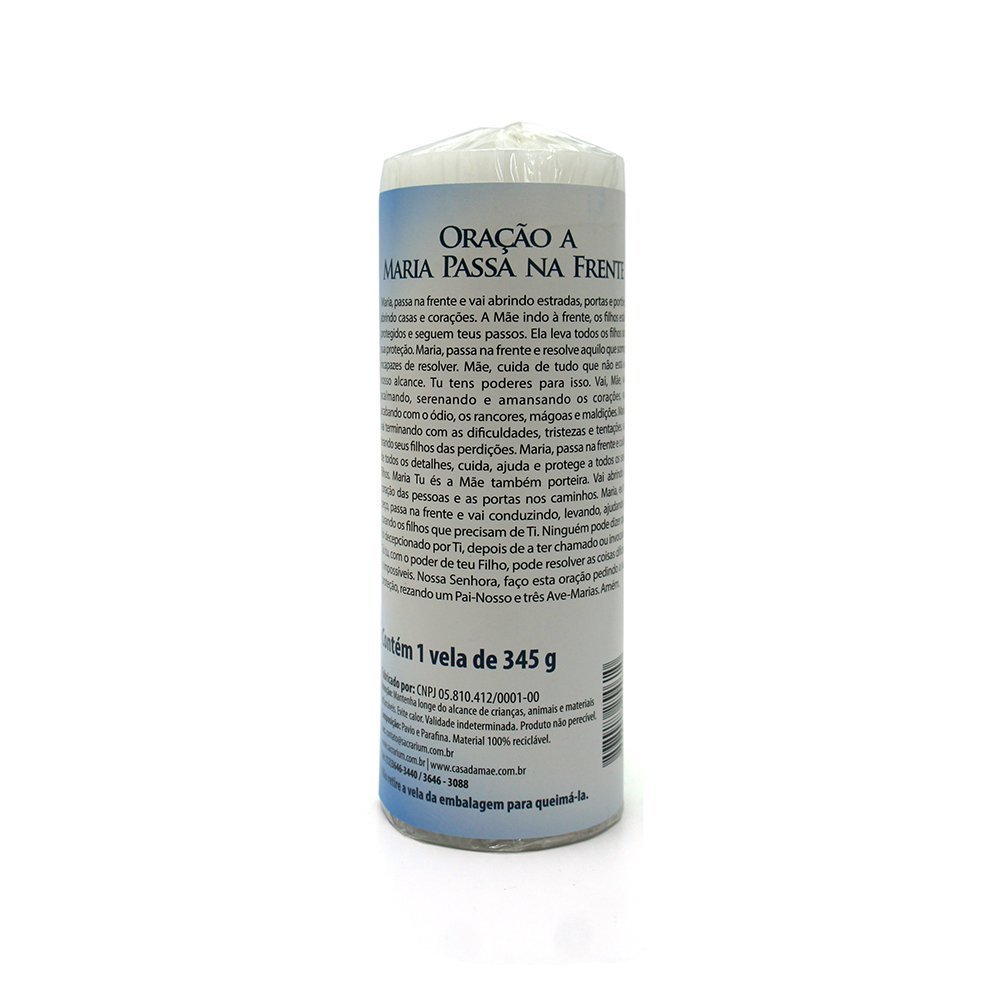 Vela Tradicional do modelo Votiva com o rótulo de Maria Passa na Frente e oração no verso.