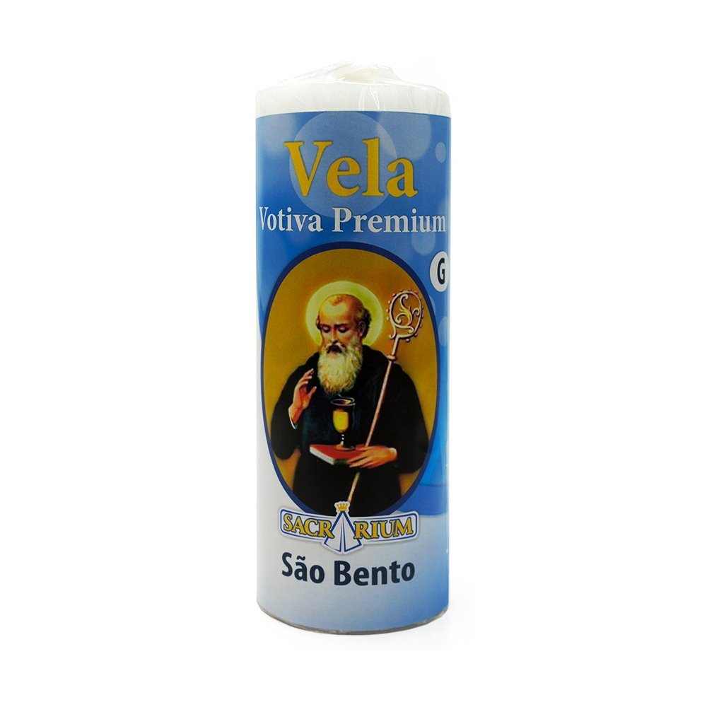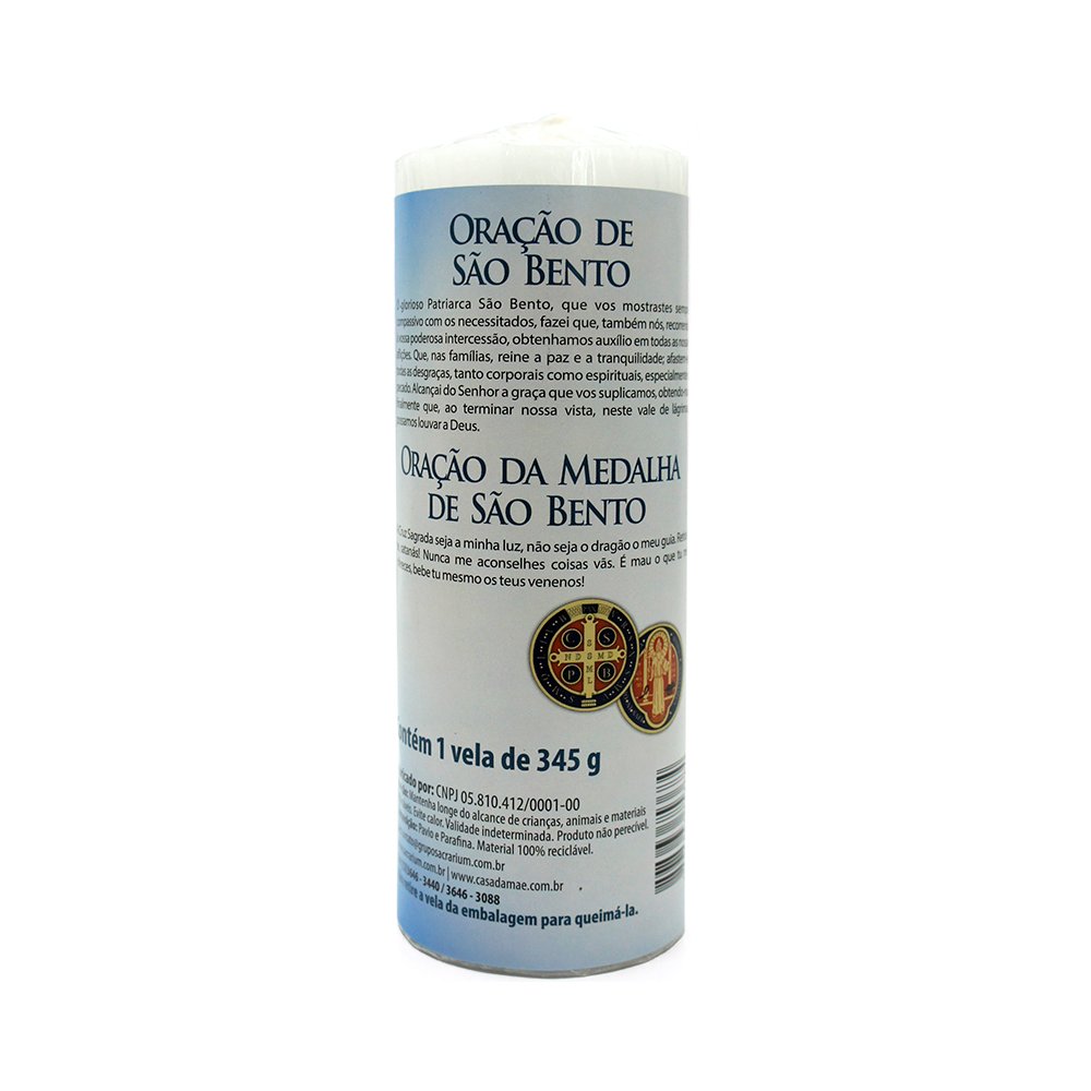 Vela Tradicional do modelo Votiva de São Bento e sua oração, possui as dimensões de 14,5cm de altura e 5,7 cm de diâmetro. Composição: Parafina e Pavio.