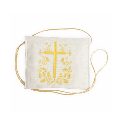 Carteira e bolsinha Viático em tecido litúrgico branca. Contendo: 1 mini bolsinha com cordão para pendurar no pescoço, 1 sanguíneo e 1 corporal.